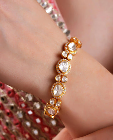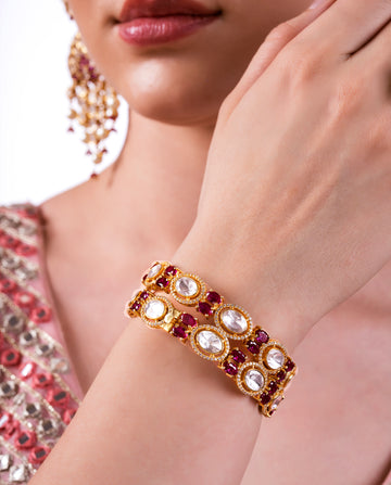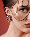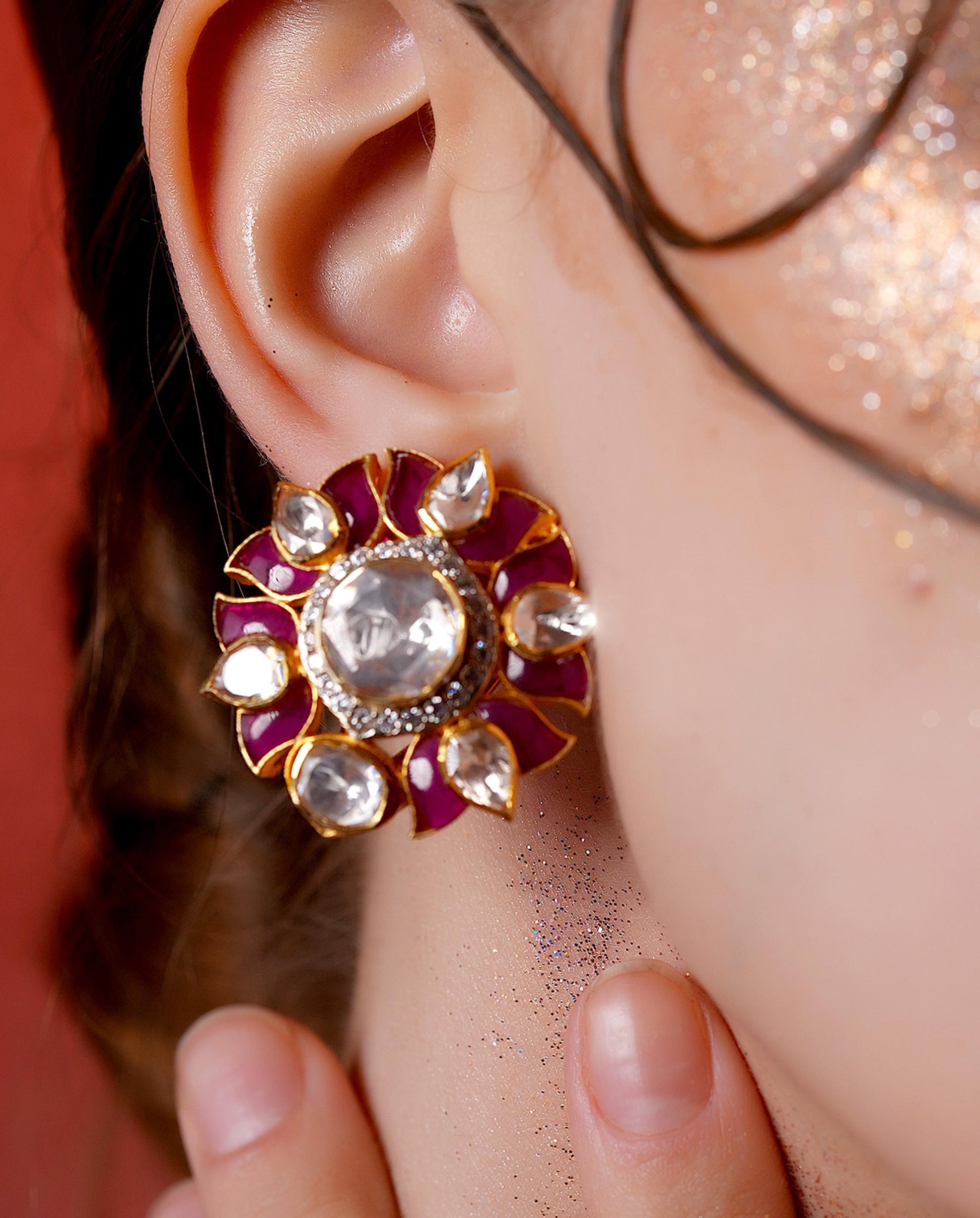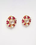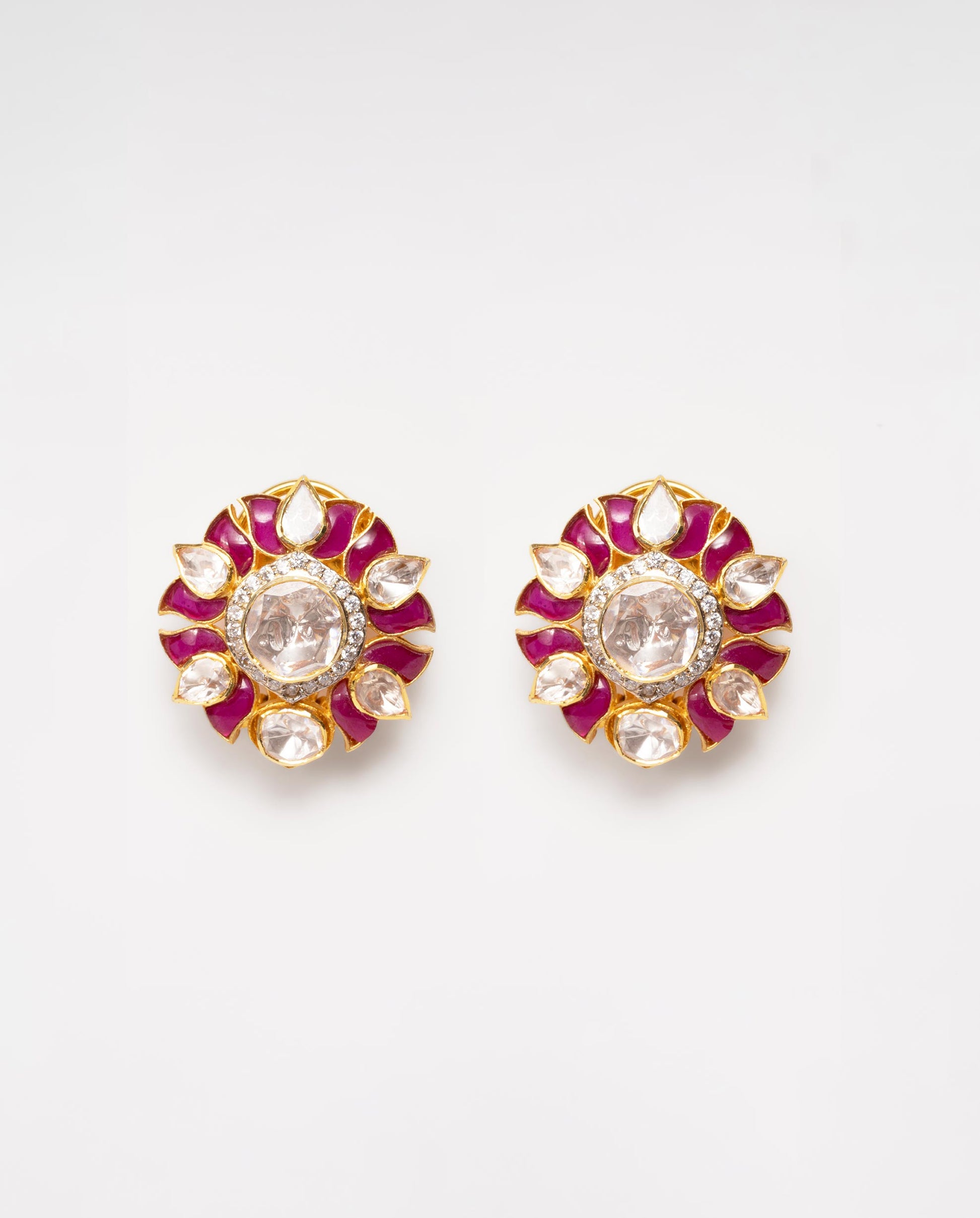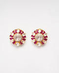 The Gul-e-Lala Studs are adorned with ruby red enamel petals, embracing a center of sparkling clear gemstones. Each stud showcases Mughal artistry with intricate gold detailing, exuding a timeless elegance.